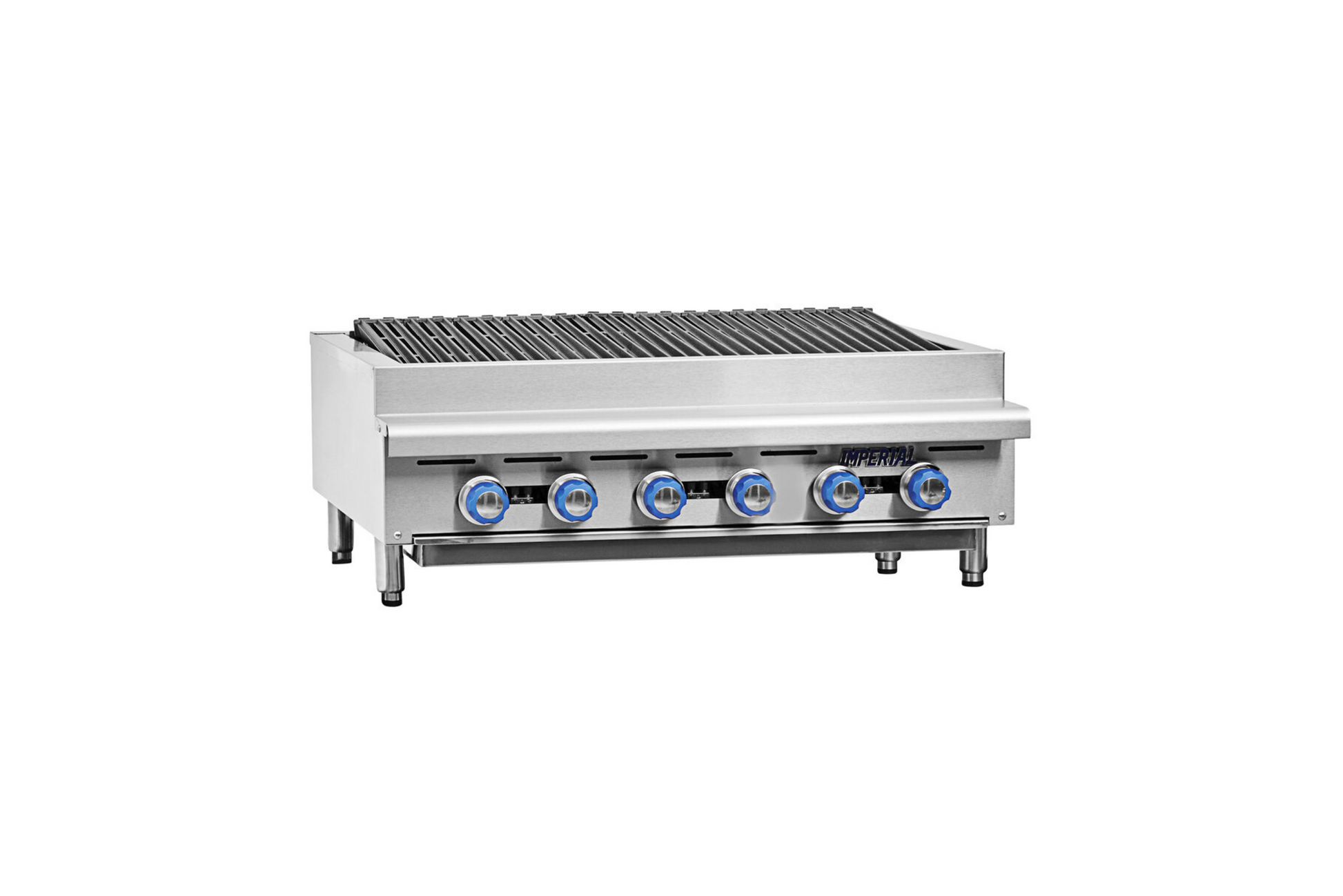 Upgrade your restaurant's grilling capabilities by adding this Imperial Range IRB-72 72" natural gas radiant countertop charbroiler. With multiple sections of removable, cast iron top grates, this unit is ideal for grilling burgers, hot dogs, chicken, and even shrimp! The slanted cooking surface is designed to provide a range of cooking temperatures, allowing you to cook various products at once. For quality performance, this charbroiler uses 12 individually controlled, cast iron radiant burners that are 5" apart and provide 15,000 BTU each. The radiant burners deflect heat towards the cooking surface, ensuring quick recovery and convenient heat retention to save you money and keep your kitchen cool. This unit's cook top is also insulated which helps to conserve energy.