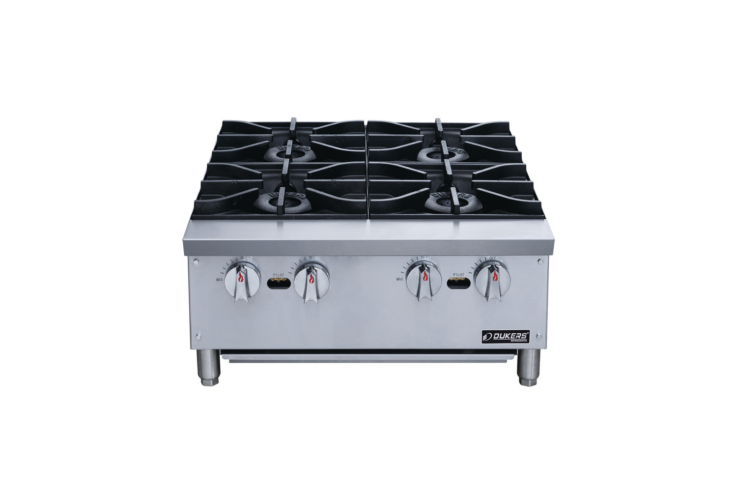 The burners of the Migali C-HP-2-12 hot plate produce 25,000 BTUs each with a 50,000 total BTU output, though establishments in high altitudes may need orifice adjustments to deliver this output. To prevent overheating, adjustable feet lift the unit above the countertops, while the unit's burners are operated with manual controls.